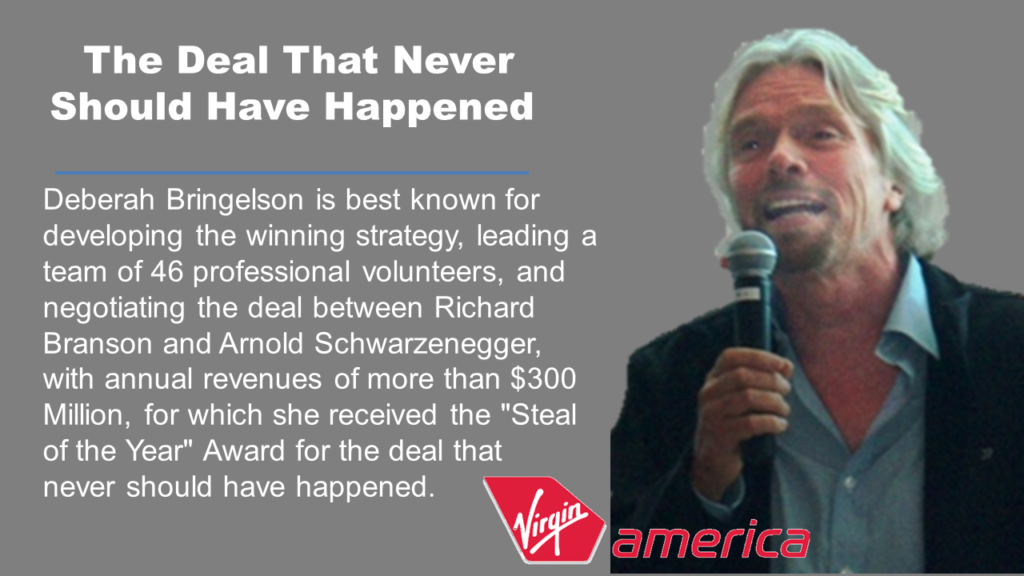 I'm probably best known for my creative ingenuity, tenacity, and leadership while negotiating the Virgin America deal between Sir Richard Branson and Arnold Schwarzenegger, for which I received the “Steal of the Year” award, for the deal that never should have happened. I'm an internationally recognized Business Development and Empowerment Expert, who has appeard on stages and consulted with clients in 17 countries.